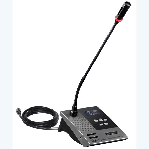 1、智能數字化設計控制電路,功耗低。 2、外置三鍵表決、電子簽到功能。 3、獨特的40CM長管,360度全方位旋轉設計,可拆卸;高保真單指向性電容咪芯,拾音距離遠、聲音還原度好、清晰度高、噪音小。 4、主席單元有優先發言權,可隨時關閉其他列席單元。 5、128X64LCD液晶,顯示單元身份、發言模式、發言狀態、發言時間。 6、優良抗手機干擾能力。 7、無噪音輕觸開關設計,操作靈活; 8、獨有音箱網外觀設計內置揚聲器,可用于會議擴音及播放會議背景音樂。 9、輕觸開關音量控制設計,可調節音量大小。 10、左側設計有3.5音頻輸出,收聽其他列席會議發言內容。 11、會議單元支持熱插拔功能,自帶2.1米8P連接線;手拉手連接模式,安裝簡便,操作靈活。 類型: 電容式 指向性: 單一指向性 頻率響應: 30Hz-18KHz 靈敏度: -43±2db@1KHz 輸入電壓: DC 9V(主機供電) 最小輸入阻抗: 1千歐 新噪比: 68 dB 輸入導線: 2.0M 8P屏蔽線 附件: 防風海綿、2.0M 8P T3M屏蔽線 SY-870B代表單元(下圖)