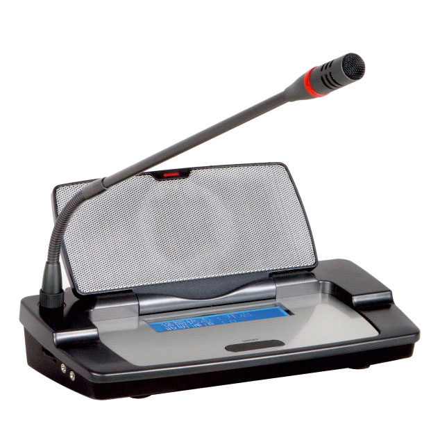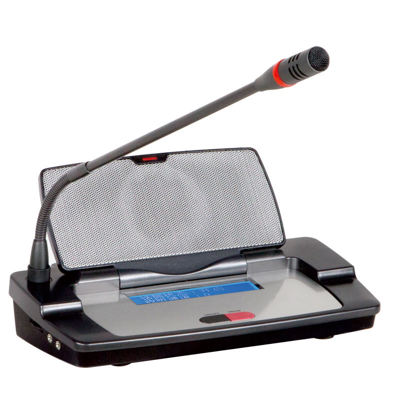◆ 具麥克風發言按鍵及發言指示燈,可控制及顯示麥克風開啟/關閉; ◆ 單指向性、具防氣爆音、內建防風防護罩之功能; ◆ 具有主席優先控制按鍵,可啟動系統提示音提醒所有出席人員注意,可設定永久終止或暫停終止所有發言代表麥克風單元動作; ◆ 具有可插拔式鵝頸可繞性麥克風桿,并具有發言指示燈環; ◆ 單元由系統主機供電。輸入電壓為DC24V,屬于安全范圍; ◆ 具兩組3.5mm立體聲輸出插座,可作錄音及連接MIC用; ◆ 單元具有8芯插座用子系統“T”型連接;內置高保真揚聲器及外接耳機插孔; ◆ 可繞式電容麥克風,并配可更換式防風罩; ◆ 話筒桿具有加長型可供選擇;麥克風具有雙色燈環; ◆ 系統中主席單元不受限制,并可置回路中任何位置; ◆ 具有一組輸出插孔和一組無線MIC輸入插孔(可選項); ◆ 具有強制切斷代表單元麥克風發言的優先功能和主席優先的提示音; ◆ 具有主席專有模式:主席按PRIO鍵關閉發言狀態的代表單體后,所有代表單元不能在開啟,直至該主席單元結束發言關閉麥克風; ◆ 內建高品質喇叭(當麥克風開啟時,喇叭自動靜音); ◆ 內含會議麥克風單元連接線; ◆ 符合國際會議設備電器認證標準(IEC60914)及國際安規標準UL或CE認證; ◆ 頻率響應:80Hz~16kHz;靈敏度:-44dB±2dB; ◆ 咪桿長度:390mm;外觀尺寸:207mmX117mmX60mm;參考講話距離:15cm~50cm;凈重:1kg