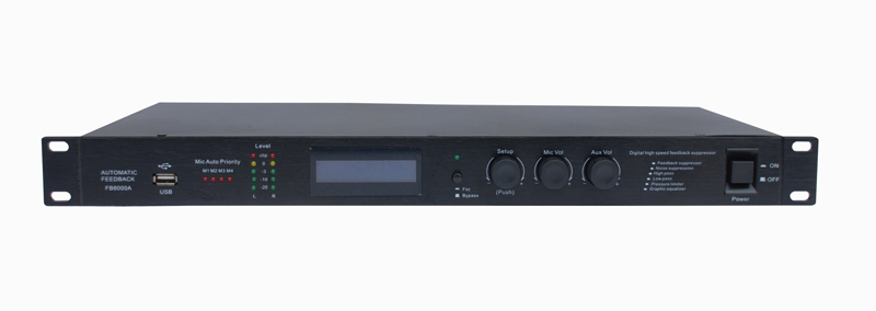 FB8000A:功能包含八路混音、反饋抑制、均衡、自動(dòng)壓限、幻象電源,支持中控、 話筒部分可以任意切換錄音輸出; 一、產(chǎn)品功能特點(diǎn): 1):2個(gè)通道音樂(lè)輸入,8路麥克風(fēng)輸入。2X16藍(lán)色LCD屏顯示 2):本機(jī)內(nèi)置48V幻象電源,后面板帶總幻象開(kāi)關(guān),(話筒1~4有四選一功能,話筒5/8直通話筒7/8 48V幻象電源自帶開(kāi)關(guān)可以單獨(dú)選擇接無(wú)線麥克風(fēng)) 3):本機(jī)具有高、低音調(diào)節(jié)和增益調(diào)整功能。 4):話筒自動(dòng)四選一:在發(fā)言者講話時(shí),可任意選擇其中一只或多只話筒開(kāi)啟,離發(fā)言者遠(yuǎn)的話筒將自動(dòng)音量關(guān)閉,其作用是:a:減小外界環(huán)境噪聲經(jīng)話筒傳送到揚(yáng)聲器而產(chǎn)生的噪音,有利于會(huì)場(chǎng)的安靜和發(fā)言者語(yǔ)音的清晰度。b:減小由揚(yáng)聲器發(fā)出的聲音二次傳入話筒形成正反饋而產(chǎn)生嘯叫的條件。 5):自動(dòng)壓限器功能:本機(jī)帶自動(dòng)自動(dòng)壓限器,通過(guò)COMPRESS調(diào)整總輸出電平。在多話筒同時(shí)使用時(shí), 可防止因整體系統(tǒng)的增益上升,而產(chǎn)生的回饋。 6):反饋抑制功能:采用自適應(yīng)環(huán)境嘯叫抑制算法,內(nèi)置24Bit A/D、D/A轉(zhuǎn)換;24位DSP處理器,48KHz高速采樣。采用高速浮點(diǎn)數(shù)字音頻處理器和先進(jìn)的子帶(Sub-Band)回聲消除(Echo Cancellation)技術(shù),可高速全自動(dòng)完全消除嘯叫和回聲,同時(shí)讓現(xiàn)場(chǎng)音頻精準(zhǔn)清晰實(shí)時(shí)送出. 可以通過(guò)“FSC/BYPASS”切換。 7):內(nèi)置自適應(yīng)動(dòng)態(tài)噪聲濾波器,可濾掉現(xiàn)場(chǎng)環(huán)境的背景噪聲但不影響語(yǔ)音信號(hào)高質(zhì)量的傳送。系統(tǒng)智能電平控制技術(shù),可以獲的到清晰、持續(xù)的、信號(hào)電平無(wú)明顯波動(dòng)的語(yǔ)音信號(hào)。內(nèi)置AGC雙向控制,具有區(qū)分加強(qiáng)信號(hào)和輕柔信號(hào)的能力, 8):鍵盤(pán)上鎖功能:當(dāng)管理員將設(shè)備調(diào)試完后,再將面板按鍵鎖住,防止非管理員進(jìn)行操作。 9):全自動(dòng)化操作的工作方式,免人工調(diào)試,無(wú)論房間環(huán)境中位置、溫度、濕度、 裝飾的改變,系統(tǒng)安裝都無(wú)需進(jìn)行聲場(chǎng)調(diào)試,精準(zhǔn)可靠使用簡(jiǎn)單。 10):內(nèi)置10段圖示均衡器:輔助調(diào)節(jié)音色和反饋嘯叫點(diǎn). 11):8路切換話筒錄音輸出切換開(kāi)關(guān),開(kāi)關(guān)OF時(shí)該路話筒沒(méi)有輸出. 12):本機(jī)帶平衡輸出和一組輔助錄音輸出。 13):各自適應(yīng)反饋抑制功能可通過(guò)本機(jī)USB連接電腦設(shè)置.支持中控調(diào)節(jié)