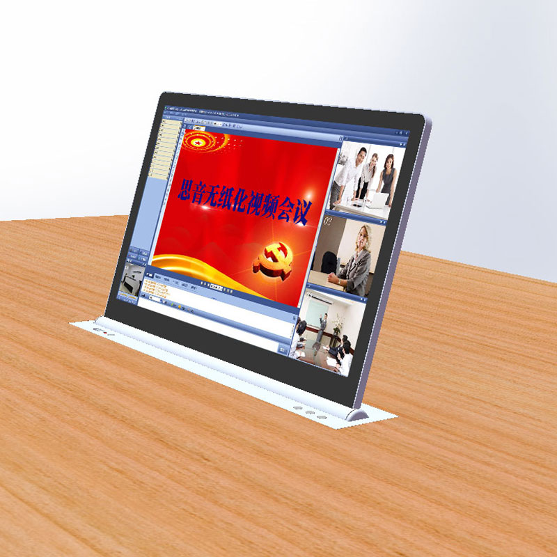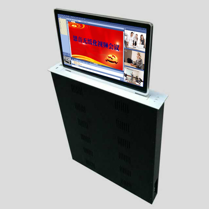 產品本身內置LED顯示屏,超薄機身和鋁合金精拉絲氧化面板結構,齒合式直線導軌傳動方式,機械防夾手設計,一體化機身防護,外觀無螺絲,產品使用安全可靠,美觀大方。外置VGA、DVI、HDMI等多重信號接口和RS232/485控制接口,產品在啟動時,液晶顯示屏升降器從箱體內部升出桌面并自動為顯示屏供電,產品設有智能仰角0-15°可調節角度功能,滿足各個人群的顯示屏仰角使用需要。當產品使用完成需要關閉時,顯示屏自動返回升降隱藏于箱體內部并自動斷開顯示屏電源,起到保護顯示屏并節約用電的作用。產品具有防盜、防塵、和保持桌面平整清潔,會議場所整齊有序等功能。本系列產品可按客戶要求定制。